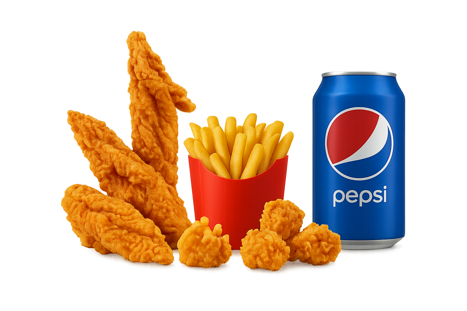 Chicken Fillet Burger (with 2 Onion Rings, Spicy Sauce, Cheese), Fries, can of Drink and 2 Spicy Wings